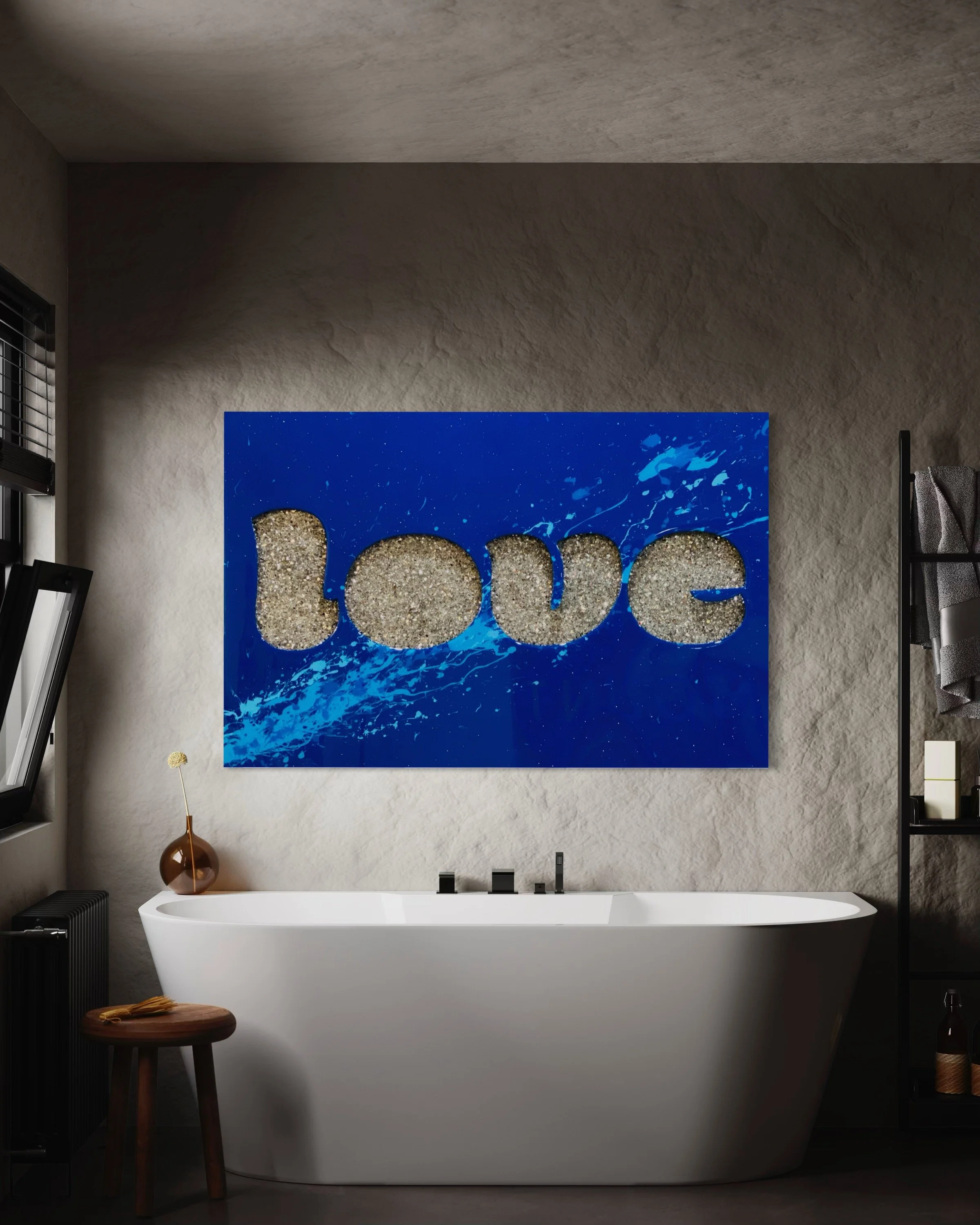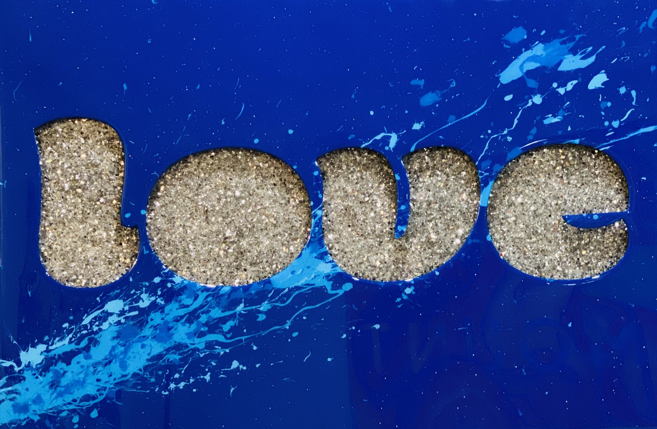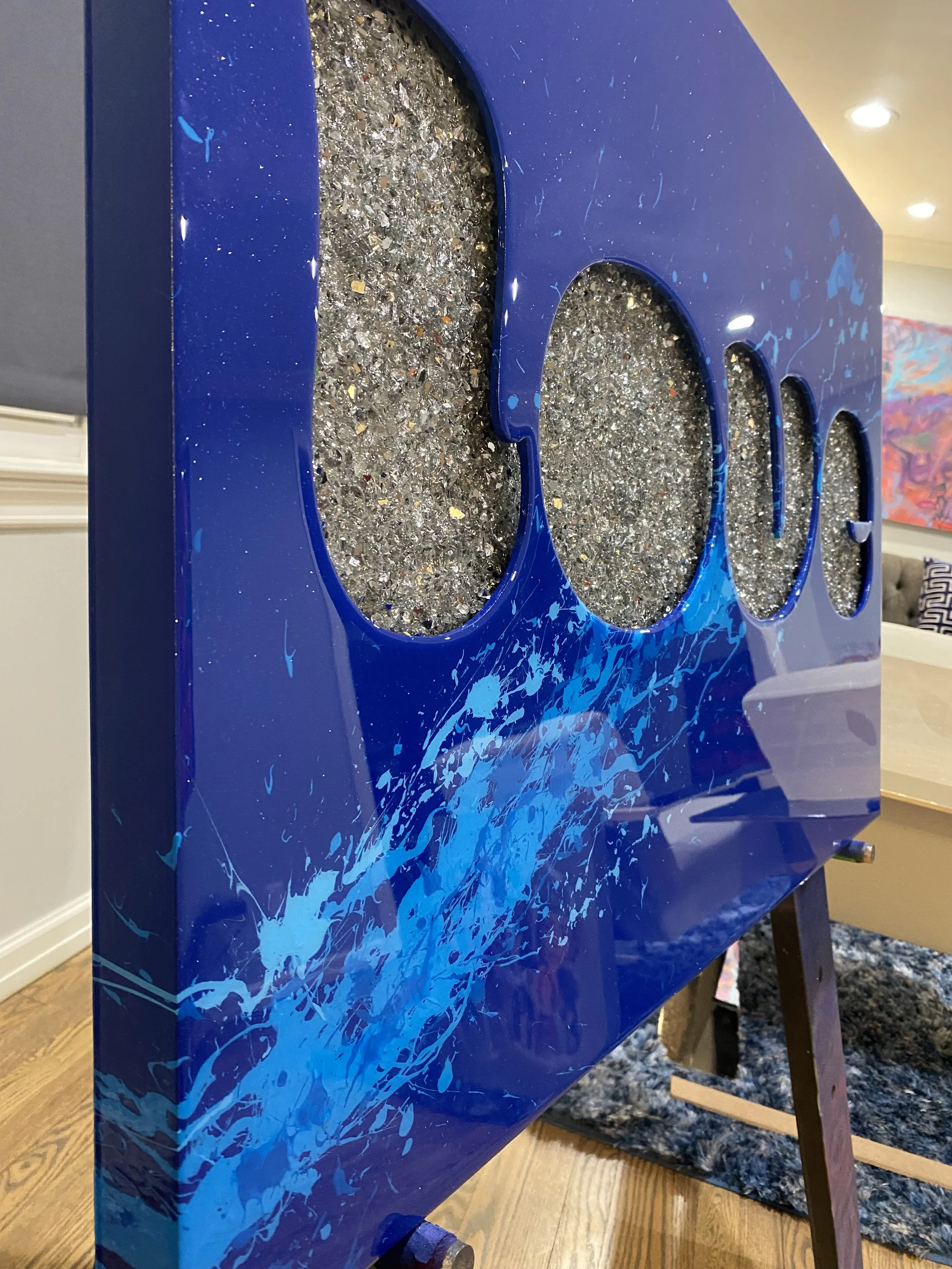 Mixed media. Spray paint on wood panel with resin finish. Debossed with crushed glass inlay.